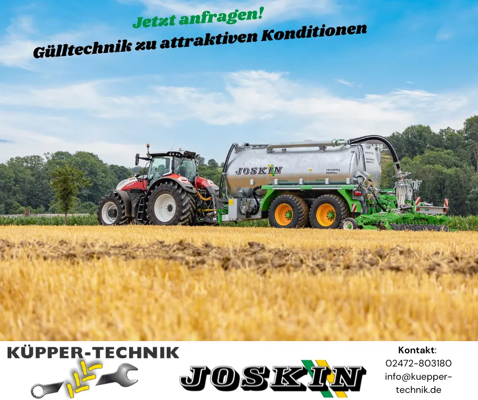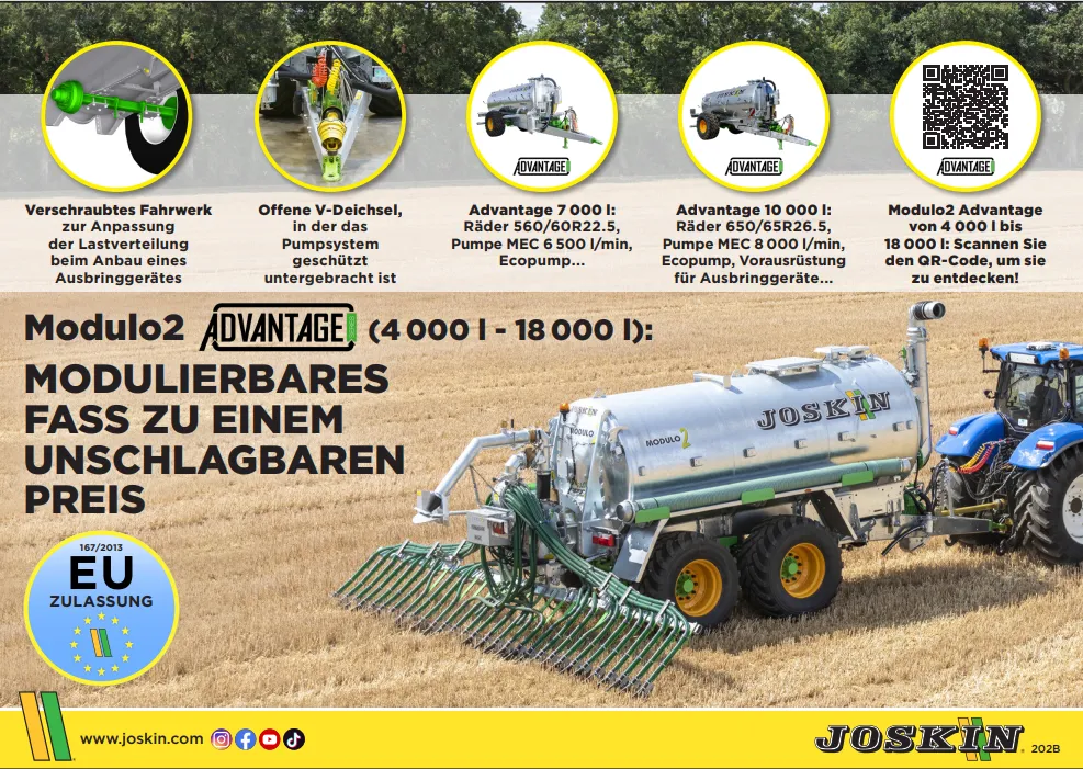 Über aktuelle News, Aktionen rundum Joskin oder landwirtschaftliche Förderprogamme halten wir Sie stets auf dem Laufenden. Joskin produziert regelmäßig sogenannte Advantage-Maschinen, die - sofern verfügbar - zu einem Sonderpreis bezogen werden können. Worum es sich hierbei genau handelt, können Sie unter https://my.joskin.com/sites/advantage?sap-language=de&category=TX#Home-show.